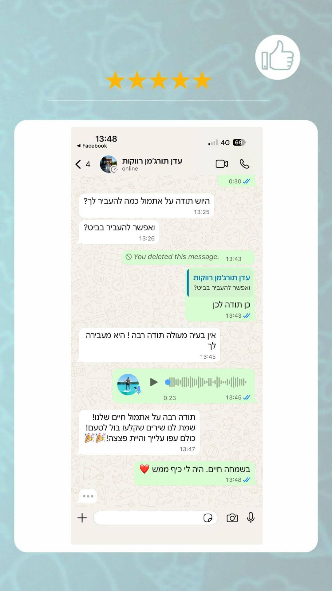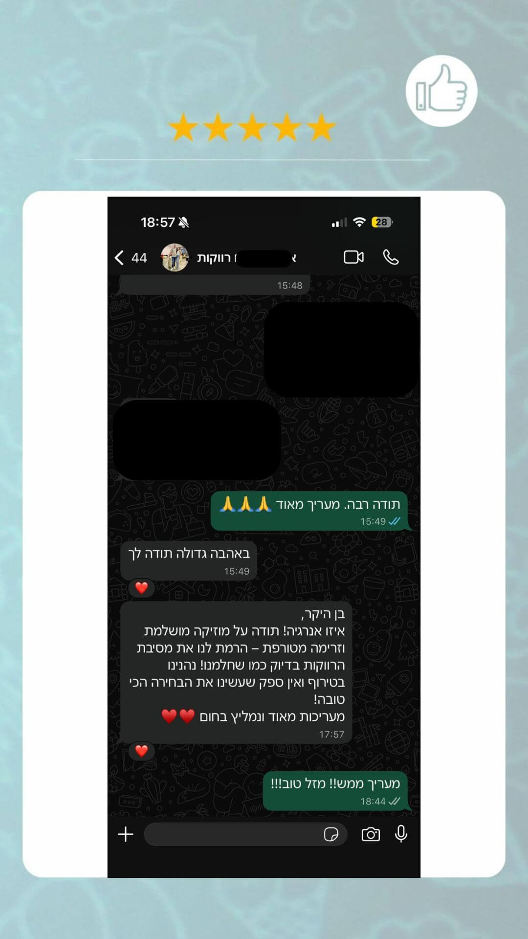 אני מגיע עם מוזיקה שתרקיד גם את החברה הביישנית ביותר בקבוצה, עם מיקס של להיטים עדכניים, קלאסיקות שכל אחת אוהבת, והכול בהתאמה אישית לאווירה ולבקשות שלכן. המטרה שלי היא ליצור חוויה שמחה, משחררת, ומדויקת – כזו שתתאים בדיוק לסגנון של הכלה ולווייב של הקבוצה.